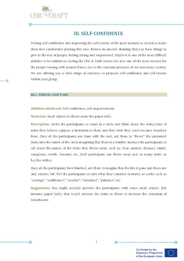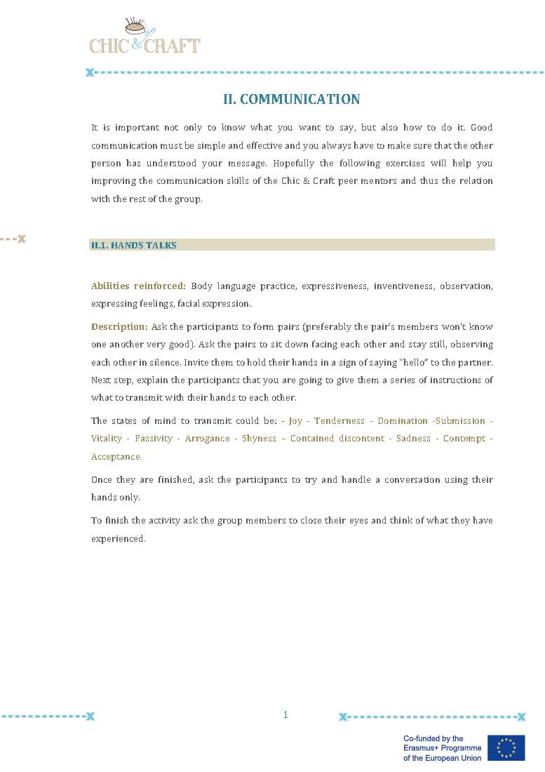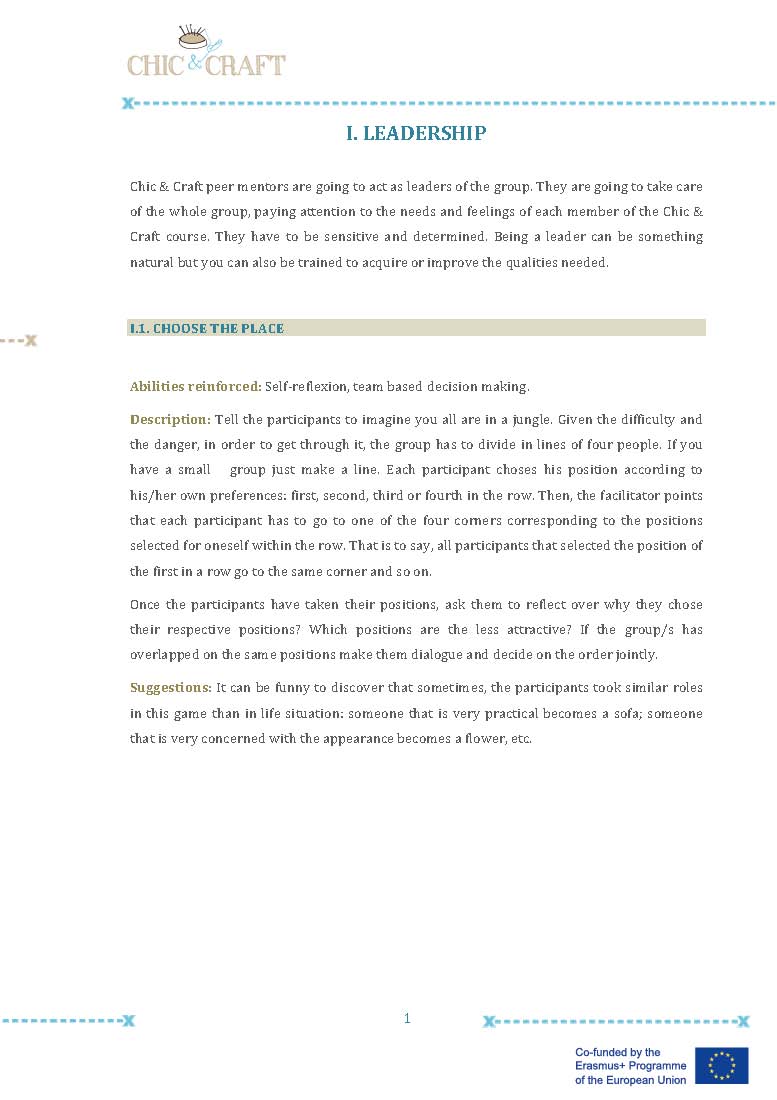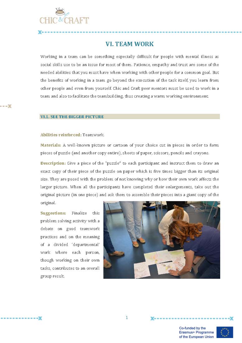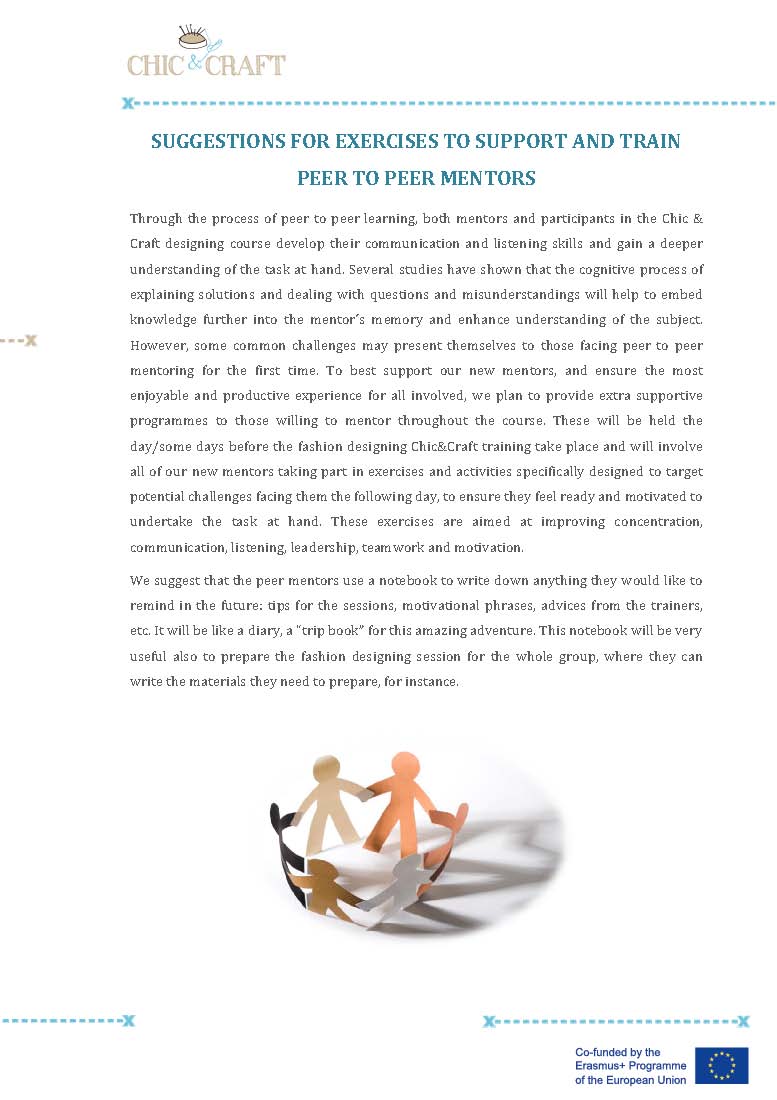 In Chic & Craft we created small groups of peer supporters (one in each pilot experience), with previous experience in designing or sewing or just with an special interest in the training course, so they could help the rest of their mates when implementing the fashion training course. These experiences have been really positive, they felt that they had something to give to their team mates, they felt empowered and valuable. For the rest of the group, the peer supporters were a reference person, a model, an inspiration and a strong motivating factor to continue with the fashion course.
