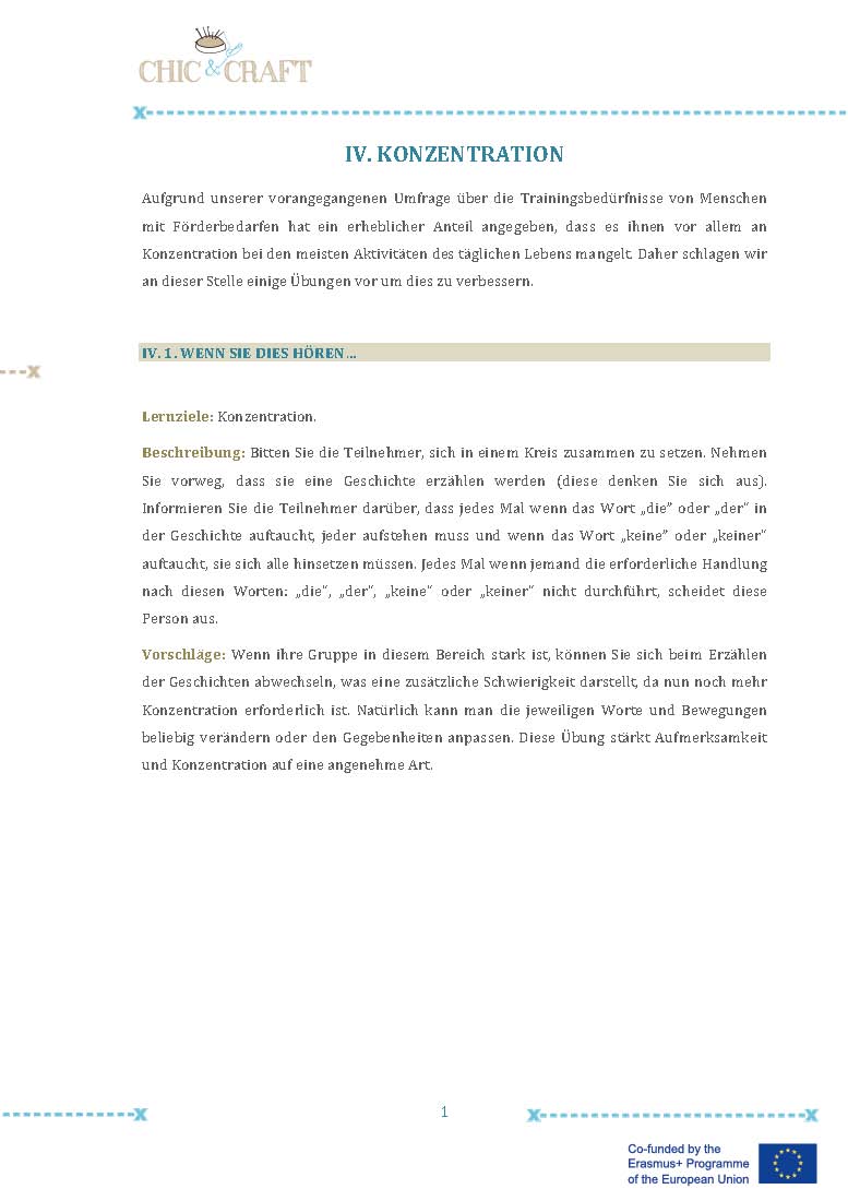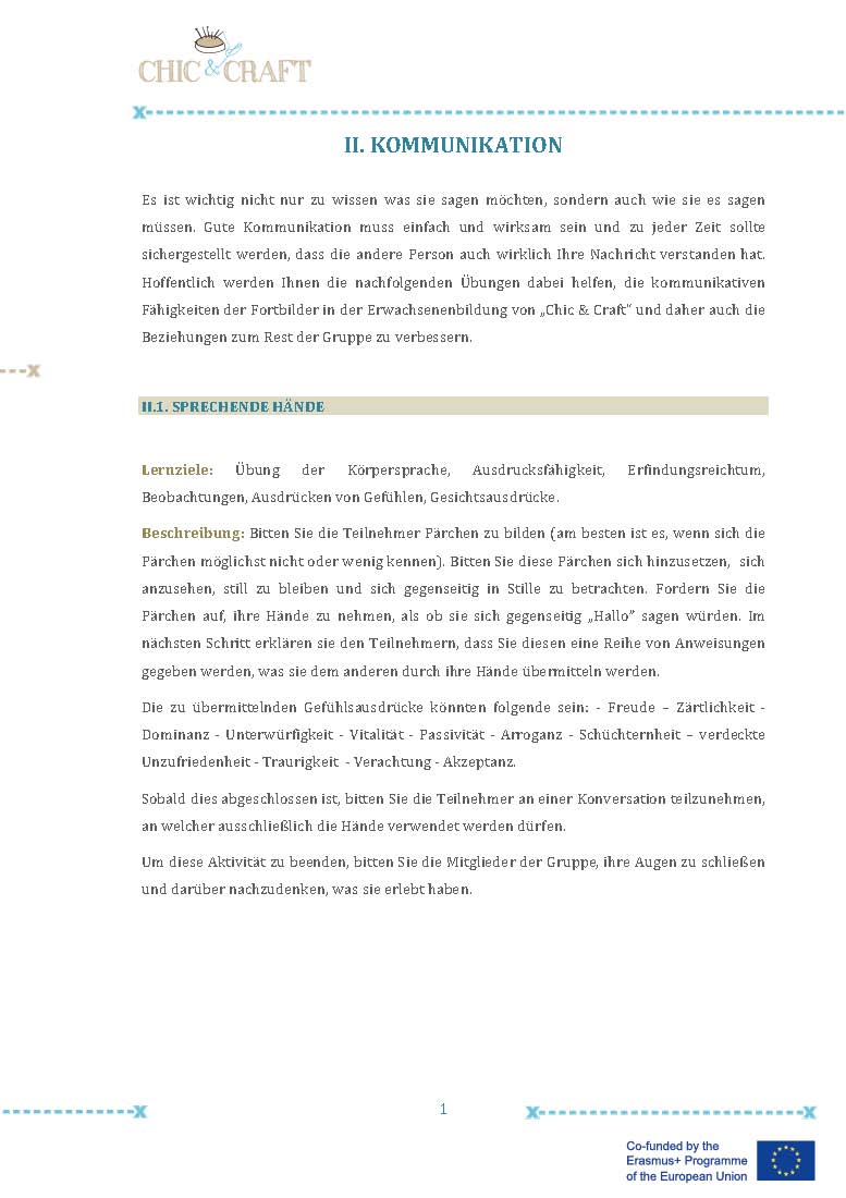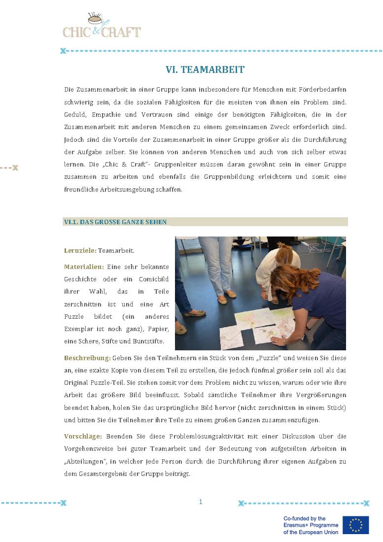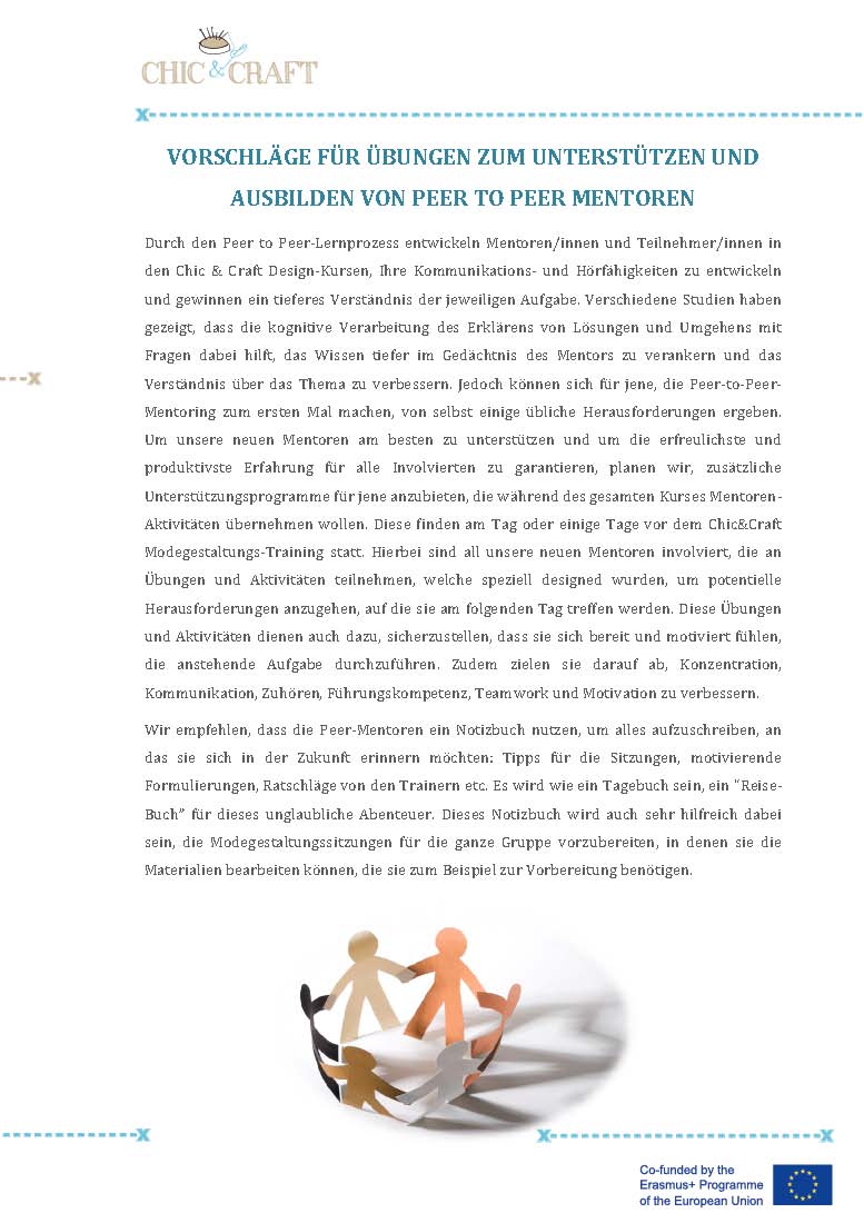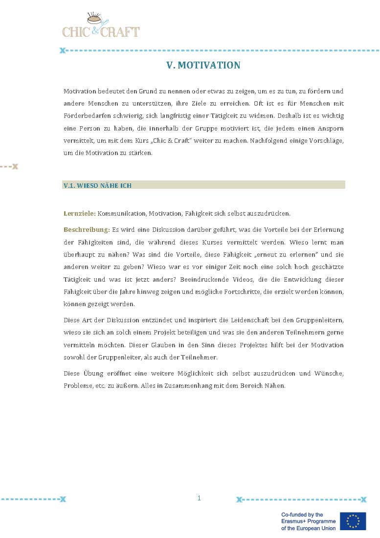 Im Projekt “Chic & Craft” haben wir daher kleine Gruppen mit Unterstützenden (eine Gruppe pro Pilotkurs) gebildet, die Vorkenntnisse in den Bereichen Design oder Nähen hatten oder ein besonderes Interesse an dem Trainingskurs vorwiesen. Die Unterstützer/-innen konnten den anderen bei der Umsetzung des Kurses helfen. Diese Erfahrung war sehr positiv, da sich dadurch das Gefühl entwickelte, dem Team etwas geben zu können und die Personen auf diese Weise Selbstbestätigung und Wertschätzung erfuhren. Sie waren Kontaktperson und Referenz für die anderen Teilnehmer/-innen der Gruppe und verkörperten ein Vorbild, eine Inspiration und ein Motivationsfaktor für den Kurs.