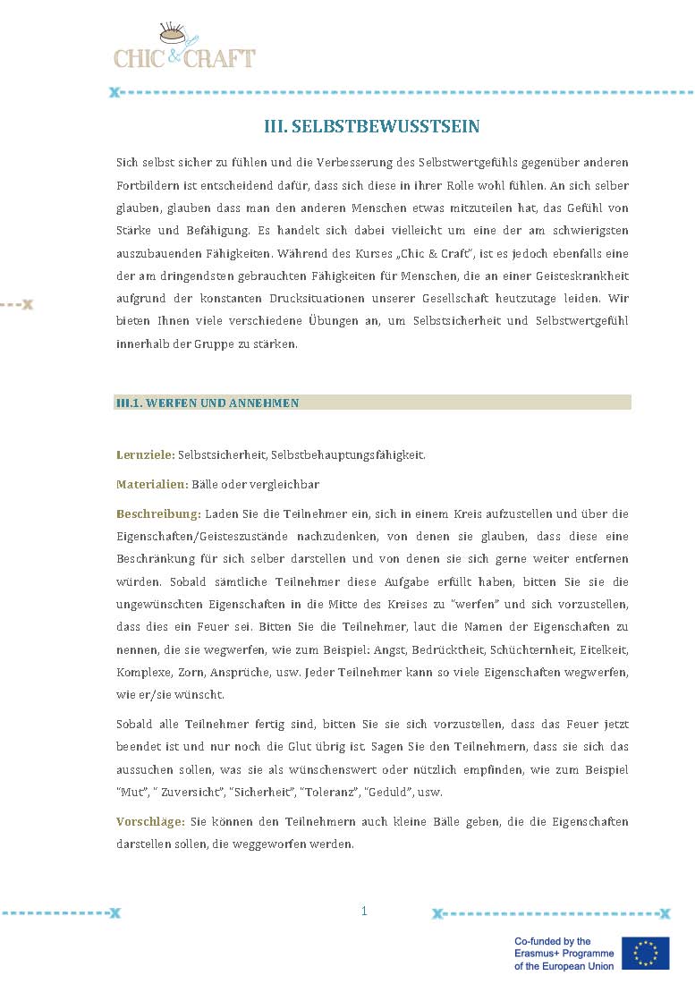 Im Projekt “Chic & Craft” haben wir daher kleine Gruppen mit Unterstützenden (eine Gruppe pro Pilotkurs) gebildet, die Vorkenntnisse in den Bereichen Design oder Nähen hatten oder ein besonderes Interesse an dem Trainingskurs vorwiesen. Die Unterstützer/-innen konnten den anderen bei der Umsetzung des Kurses helfen. Diese Erfahrung war sehr positiv, da sich dadurch das Gefühl entwickelte, dem Team etwas geben zu können und die Personen auf diese Weise Selbstbestätigung und Wertschätzung erfuhren. Sie waren Kontaktperson und Referenz für die anderen Teilnehmer/-innen der Gruppe und verkörperten ein Vorbild, eine Inspiration und ein Motivationsfaktor für den Kurs.
